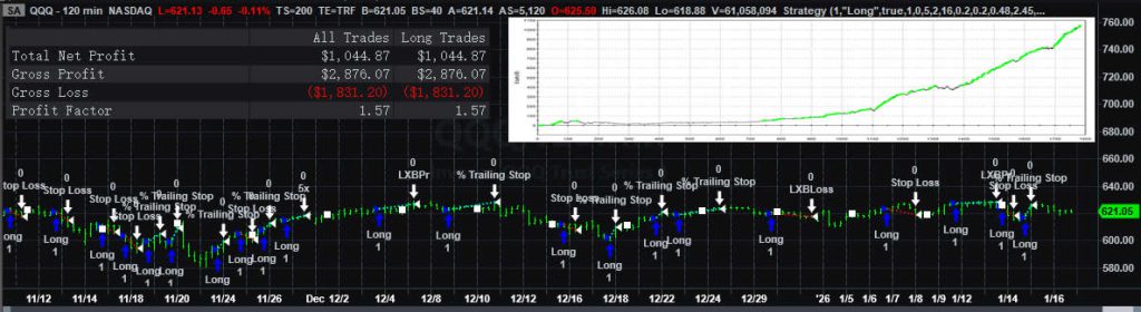 The long algorithm only goes long at a particular date of a month, and exits the long position after holding it for a fixed number of trading days. This simple strategy captures almost all upside movements of QQQ since its inception in 1999.