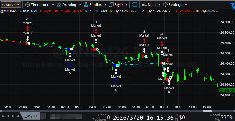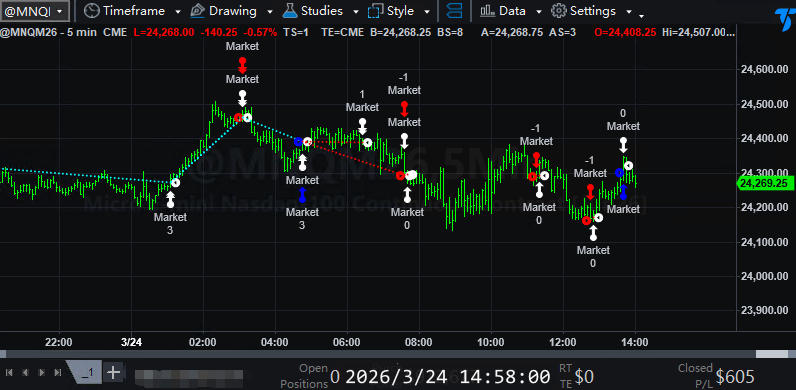 Mar 24, 2026 Tuesday, MNQ Profit $605